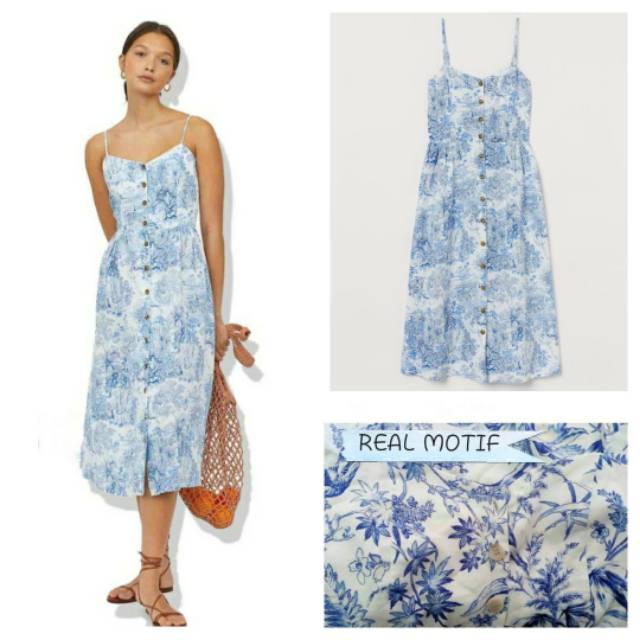 Ori H M Button Dress Linen Blend Midi Dress Hm White Blue Floral Pattern Shopee Indonesia